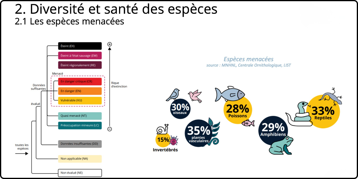 Ingénieur au Statec et auteur du rapport, Olivier Thunus est revenu sur la genèse du document, lancé en 2023. L’Administration de la nature et des forêts, l’Administration de la gestion de l’eau, le LIST, le Musée national d’histoire naturelle et la Centrale ornithologique de natur&ëmwelt ont contribué à l’exercice. « Cette publication est aussi le résultat du travail quotidien des naturalistes, professionnels ou amateurs, qui encodent des données dans des bases internationales », a-t-il souligné.