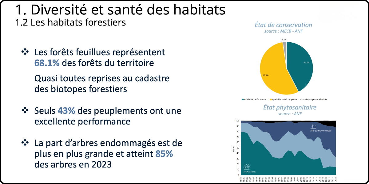 Les forêts ont illustré cette complexité : seuls 43 % des peuplements présentant un fonctionnement proche du naturel. L’état sanitaire des arbres s’est fortement dégradé. « En 1984, environ 80 % des arbres ne présentaient aucun dommage. En 2023, ce chiffre est tombé à 15 %. »