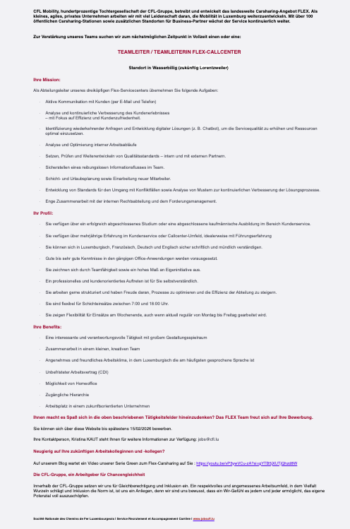 Teamleiter (M/W)/Flex-Callcenter Voir toutes les offres CFL rekrutieren ! Lien pour postuler : cliquez ici