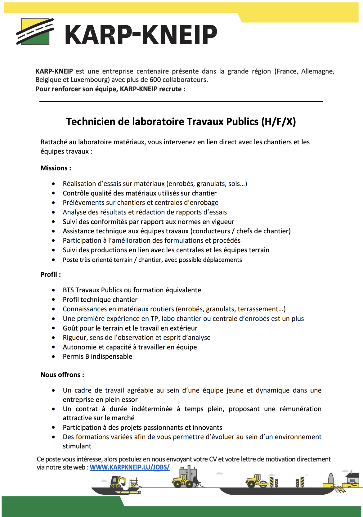 Technicien de laboratoire Travaux Publics (H/F/X) Voir toutes les offres Karp-Kneip recrute ! Lien pour postuler : cliquez ici