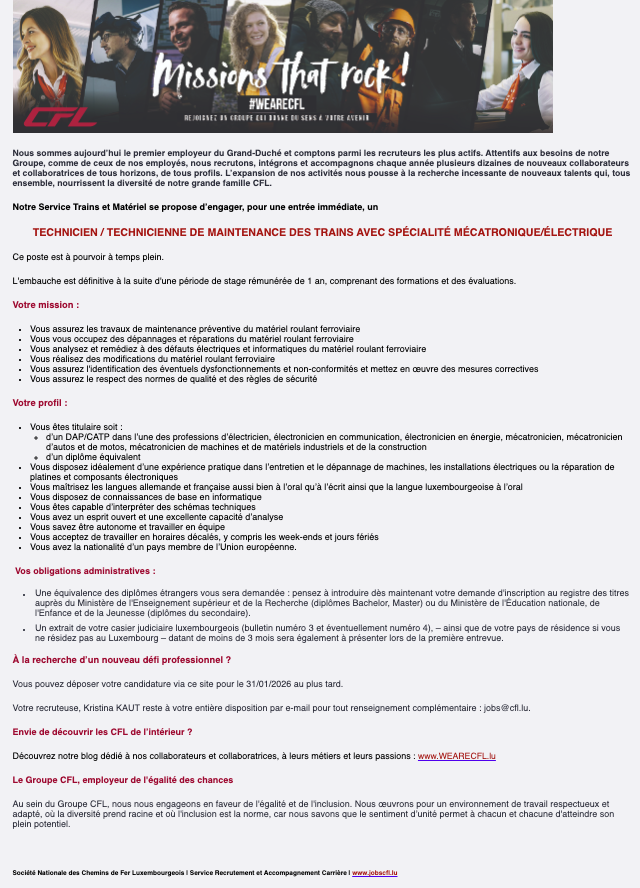 Technicien de maintenance (m/f) des trains avec spécialité mécatronique / CFL Voir toutes les offres CFL recrute ! Lien pour postuler : cliquez ici