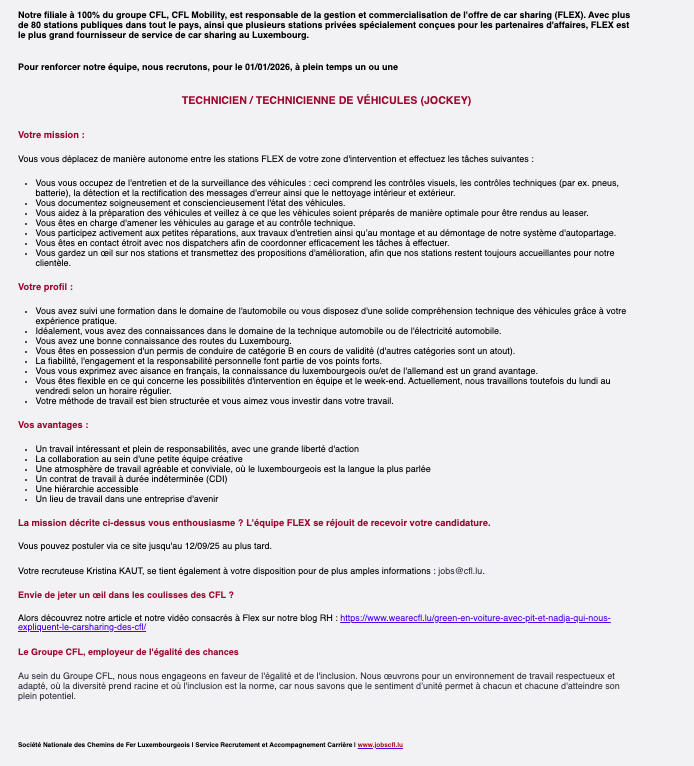 Technicien de véhicules (m/f) / CFL Voir toutes les offres CFL recrute ! Lien pour postuler : cliquez ici