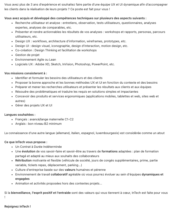 UI/UX Senior Designer (m/f) / InTech Voir toutes les offres InTech recrute ! Lien pour postuler : cliquez ici