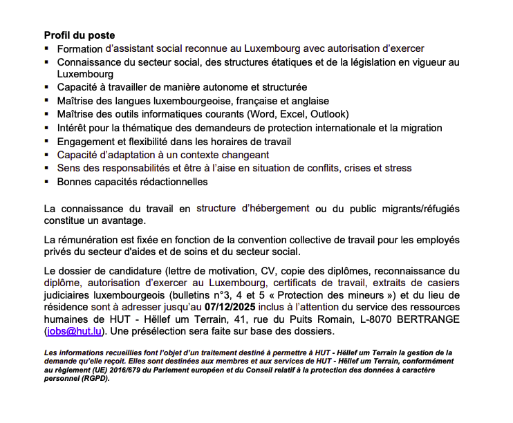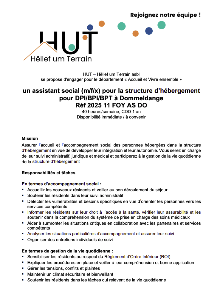 Un assistant social (m/f) / HUT Voir toutes les offres HUT recrute ! Lien pour postuler : cliquez ici