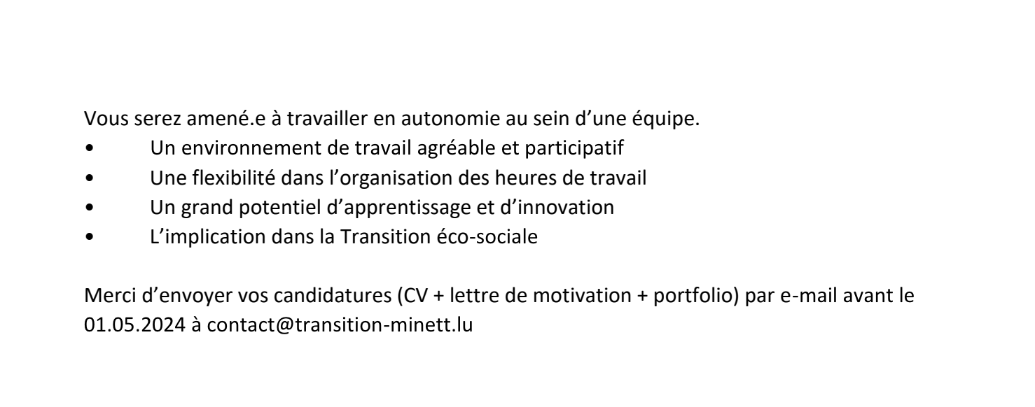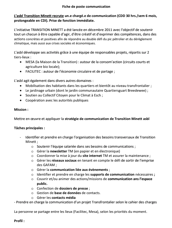 Un chargé de projet (m/f) / Transition Minett Voir toutes les offres L’asbl Transition Minett recrute ! Lien pour postuler : cliquez ici