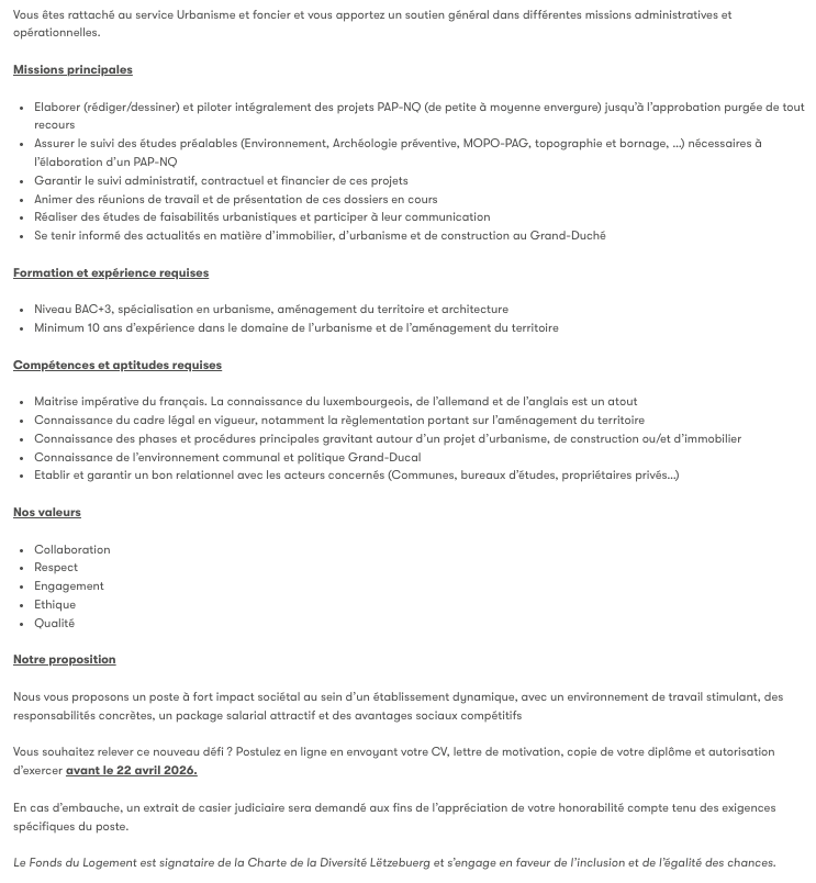 Urbaniste Aménageur (m/f) Voir toutes les offres Le Fonds du Logement recrute ! (Référence poste U&F-URB-26-01) Lien pour postuler : cliquez ici