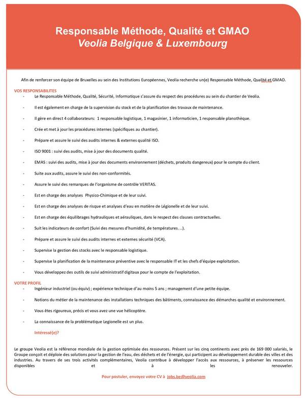 VEOLIA Belgique & Luxembourg recrute ! Voir toutes les offres Responsable Méthode, Qualité, GMAO (m/f) Plus d’informations : https://www.veolia.be/fr/carrieres/...