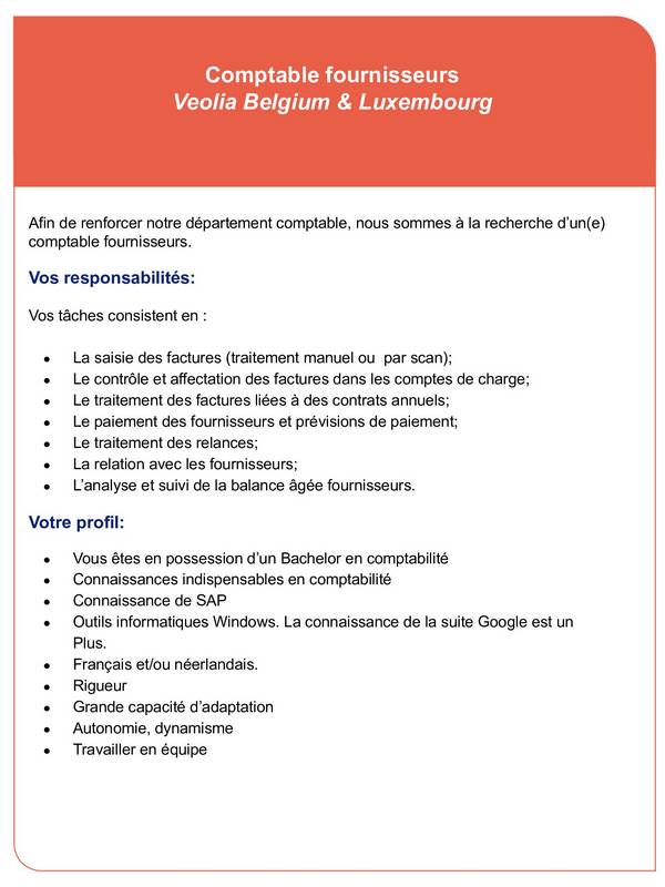 VEOLIA Belgique & Luxembourg recrute ! Voir toutes les offres Comptable fournisseurs (m/f) Plus d’informations : https://www.veolia.be/fr/carrieres/...