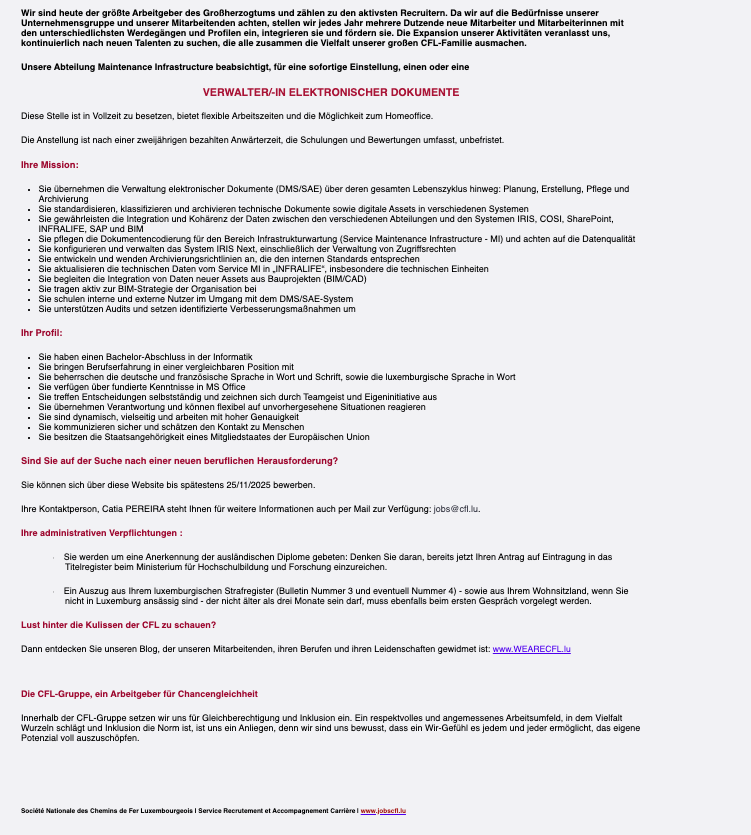 Verwalter elektronischer Dokumente (m/f) / CFL Voir toutes les offres CFL recrute ! Lien pour postuler : cliquez ici