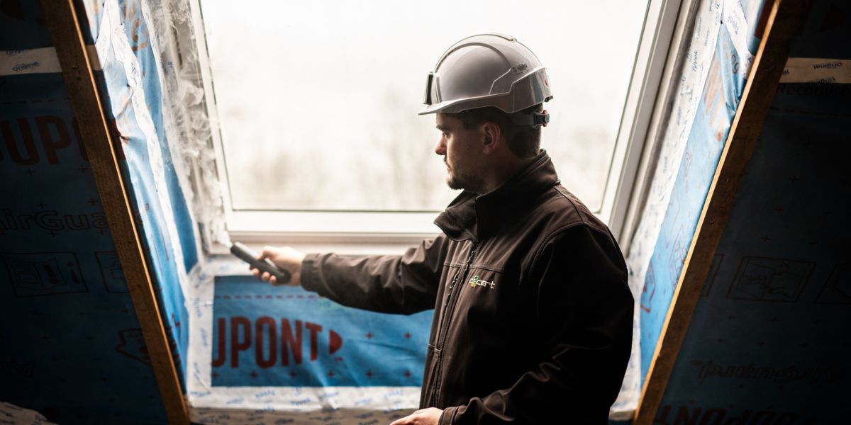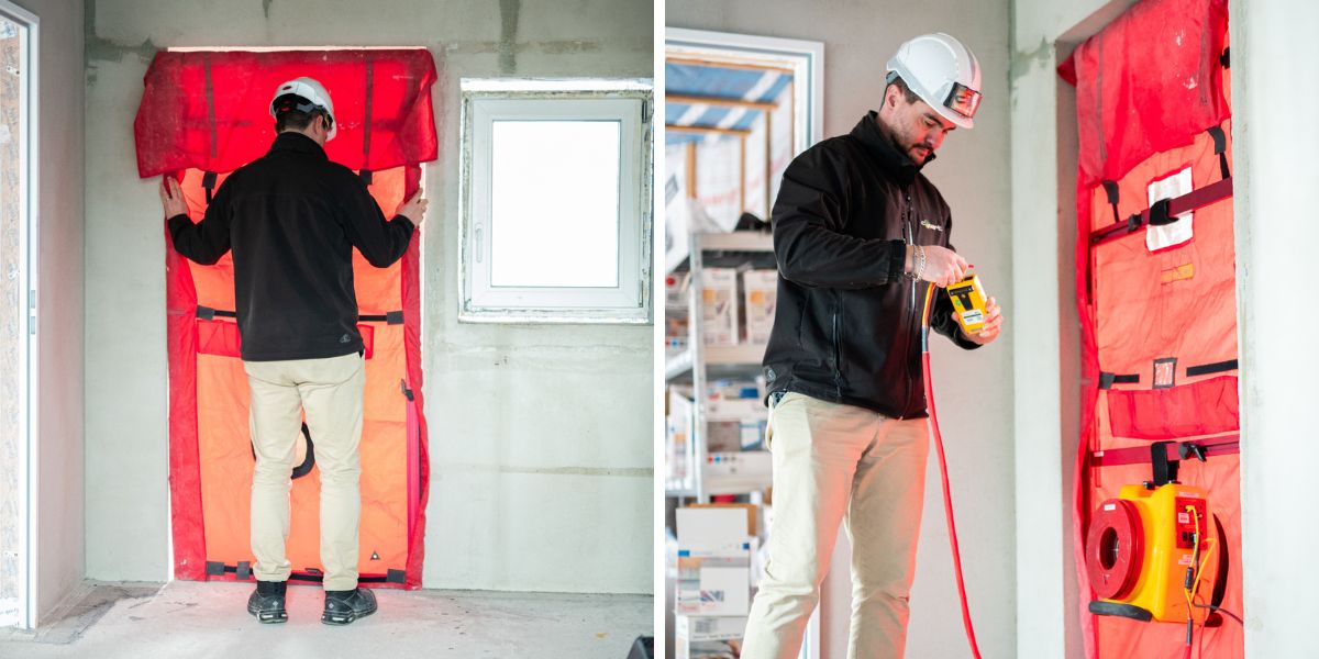 « Le défi, quand un test d’étanchéité à l’air n’est pas concluant, c’est qu’on ne peut pas partir sans avoir trouvé le problème et l’avoir résolu. Il y a des causes récurrentes : un pare-vapeur mal mis en œuvre, une gaine technique mal refermée ou encore un mauvais réglage des menuiseries. D’autres causes, plus ponctuelles, peuvent également être rencontrées : chaque chantier peut réserver son lot d’imprévus. On peut même parfois passer des heures à identifier le problème, comme cette fois où les pattes de fixation du rail d’une porte coulissante avaient été vissées dans la paroi d’une gaine technique ou cette autre fois où une importante entrée d’air provenait de la trappe de visite d’une gaine technique. L’architecte m’assurait que tout avait été correctement refermé en toiture. Nous avons donc contrôlé chaque col de cygne et chaque sortie en toiture. Après plusieurs vérifications, il a finalement fini par me demander si la laine de roche était suffisante pour assurer l’étanchéité de la gaine technique », ajoute-t-il.