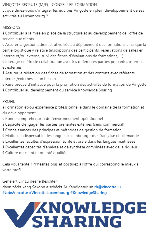 VINÇOTTE Luxembourg asbl recrute ! Voir toutes les offres Conseiller formation (m/f) Pour plus d’informations : https://www.linkedin.com/posts/jobs-vincotte-luxemburg_jobsvincotte-vincotteluxembourg-knowledgesharing-activity-6886301849272643584-6HkV/