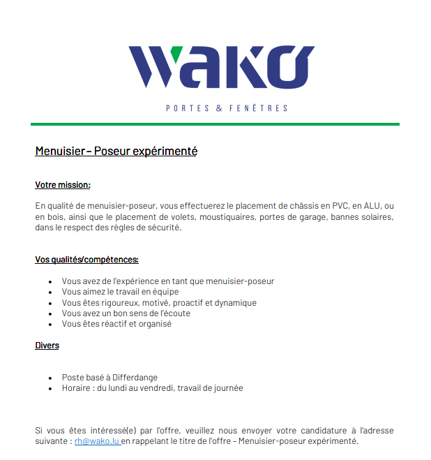 Wako S.A. recrute ! Voir toutes les offres Menuisiers poseurs expérimentés (m/f) Pour plus d’informations : https://www.wako.lu/fr/offres-demploi