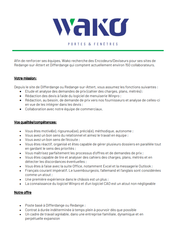 Wako S.A. recrute ! Voir toutes les offres Encodeur/Deviseur Pour plus d’informations : https://www.wako.lu/fr/offres-demploi